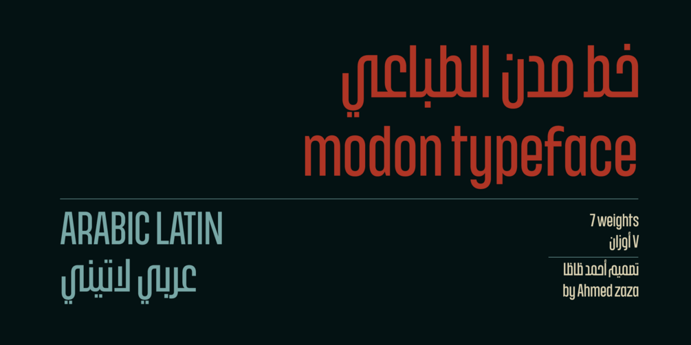 Modon is a bold condensed display Arabic and Latin typeface that has a very particular appearance. It combines the characteristics of different genres, While its design is influenced by Kufic and the Naskh style.